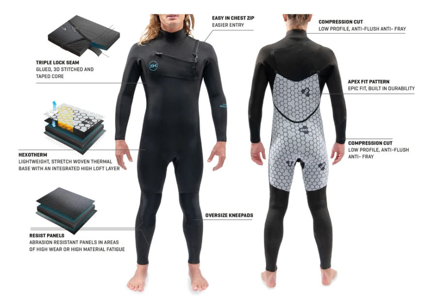 Built from the ground up, our Apex Fit pattern allows extreme freedom of movement and perfect fit without stress points. For high-stretch areas we developed FLX lining, stretch woven with reinforced elastane for next-level strength, matched with internal thermo lining with high loop insulation. Specially designed Hexo_Therm high loft is combined with quick-dry lining placed in core areas to ensure absolute warmth and comfort. Seams are triple locked—twice glued, 3D stitched, and critically taped to seal and reinforce seam junctions. Ankle and cuff seals are reinforced using Resist lining. Oversized knee panels, anti-fray compression cut cuffs, soft feel collar, YKK zips round out this rugged full suit.
