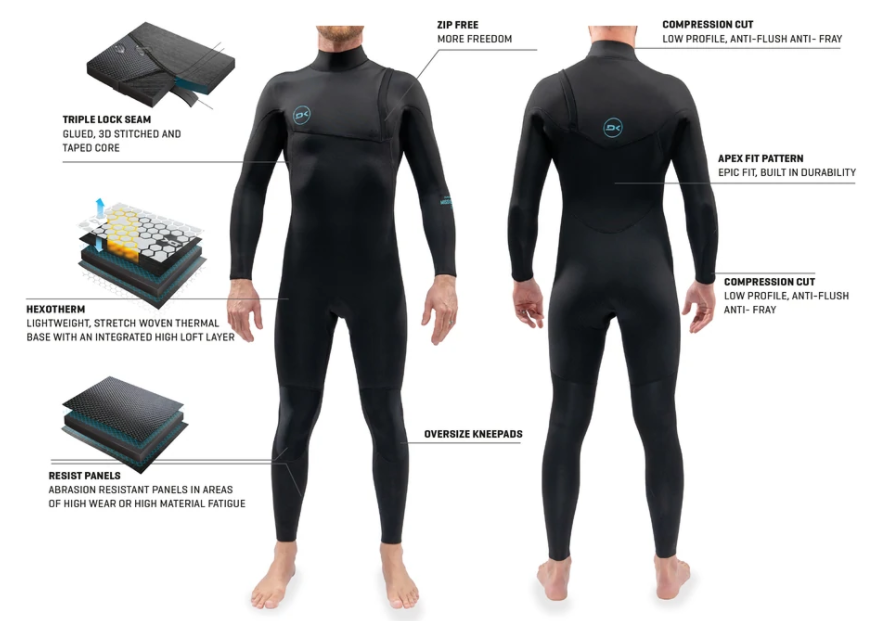 Built from the ground up, our Apex Fit pattern allows extreme freedom of movement and perfect fit without stress points. For high-stretch areas we developed FLX lining, stretch woven with reinforced elastane for next-level strength, matched with internal thermo lining with high loop insulation. Specially designed Hexo_Therm high loft is combined with quick-dry lining placed in core areas to ensure absolute warmth and comfort. Seams are triple locked—twice glued, 3D stitched, and critically taped to seal and reinforce seam junctions. Ankle and cuff seals are reinforced using Resist lining. Oversized knee panels, anti-fray compression cut cuffs, soft feel collar, YKK zips round out this rugged zip-free full suit.