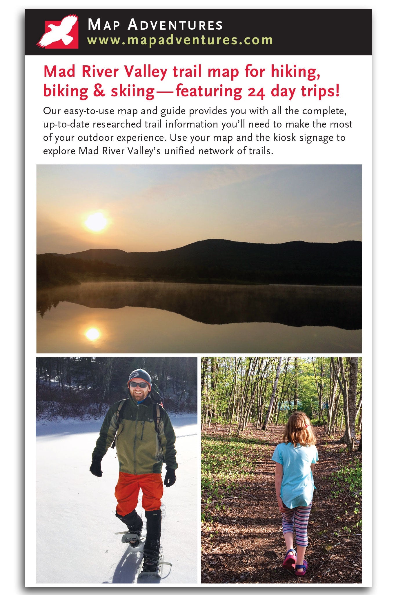 The Mad River Valley map is a year-round trail map, one side focuses on the Mad River Valley hiking and mountain bike trails. The other displays the Long Trail network that traverses the peaks of Mt Abraham, Mt Ellen and Camel’s Hump.