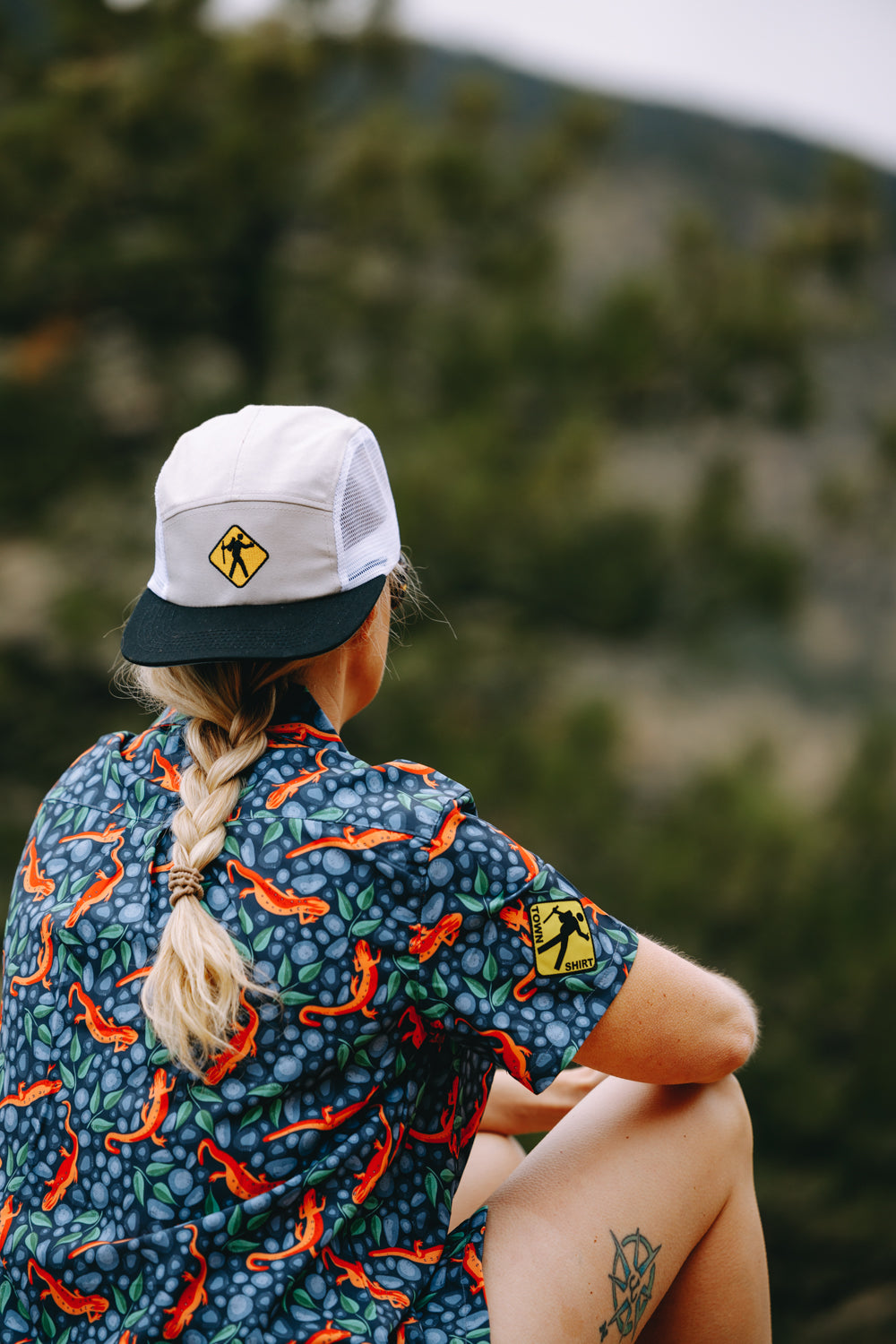 True-To-Trail Print: Inspired by the Appalachian trail, this shirt features bright orangey red Efts (a.k.a. newts) on a rocky background with leaves. The Eft's bright orange color helps deter predators but also warns hikers to watch their step.